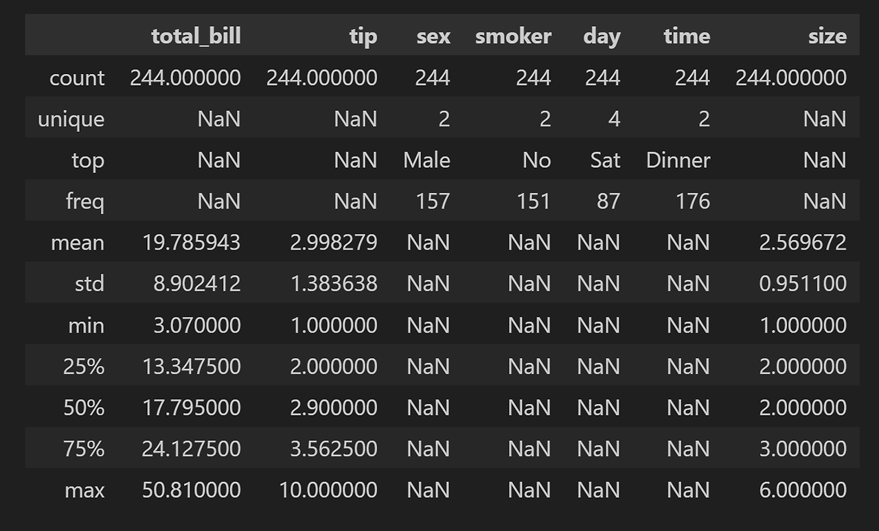 | tips_df.describe() | tips_df.describe(include = 'all') |