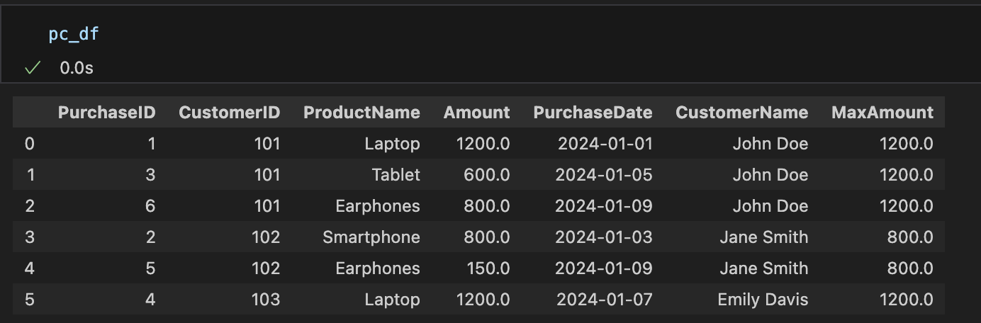 # 'CustomerID'로 그룹화한 후, 각 그룹 내에서 'Amount' 컬럼의 최댓값을 계산하고 transform 함수를 사용하면 최댓값을 그룹의 모든 행에 적용하여 반환