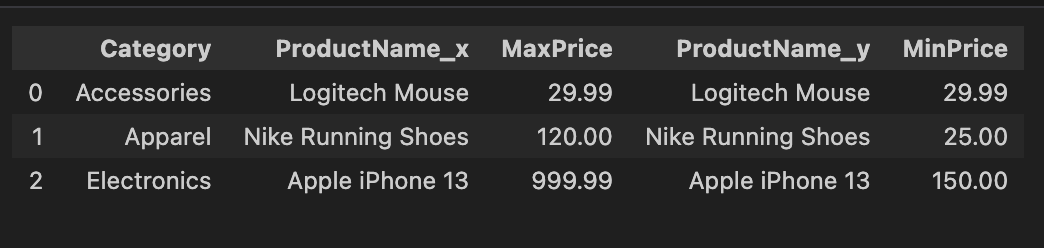 min_price_info = pd.merge(extremes_df,porducts_df, left_on = ['Category','MinPrice'], right_on = ['Category','Price'], how = 'inner')