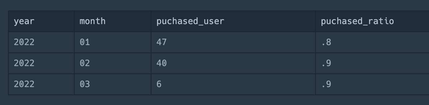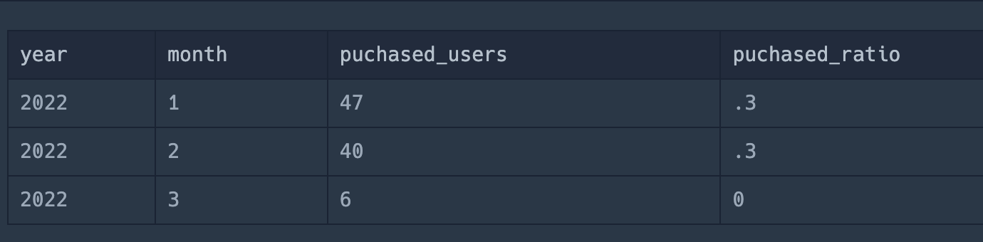 ROUND(COUNT(UNIQUE(A.USER_ID)) / (SELECT COUNT(*) AS CNT FROM USER_INFO WHERE TO_CHAR(JOINED, 'YYYY') = '2021'), 1) AS PUCHASED_RATIO