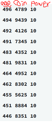 | 정답 | age = 496, power = 10인 경우의 coin |