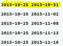 1행의 2015-10-01의 시작일이 1행의 2015-10-01의 끝날짜에 포함되지 않는 것을 찾는 것으로 출력됨