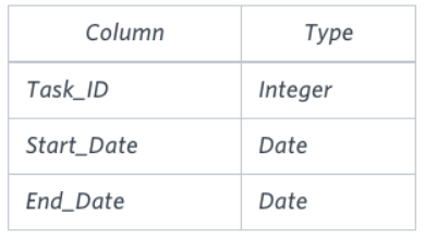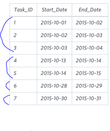 WHERE End_Date NOT IN (SELECT Start_Date FROM Projects)) b -- a와 b의 Cartesian product(cross조인)