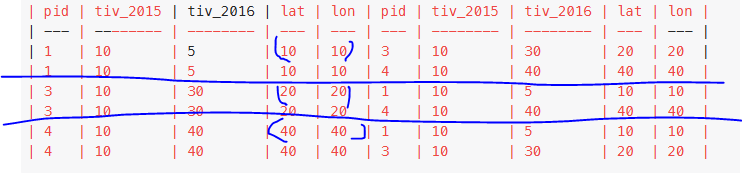 and (a.lat, a.lon) = (b.lat, b.lon)