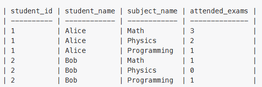 COUNT(Examinations.subject_name) as attended_exams -- 3. 학생, 과목별 집계