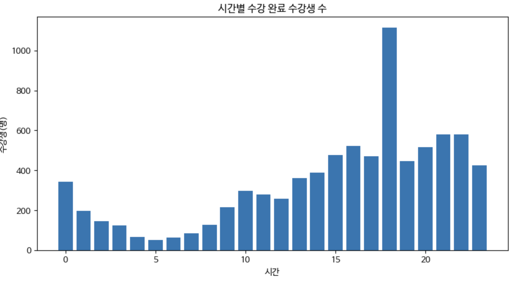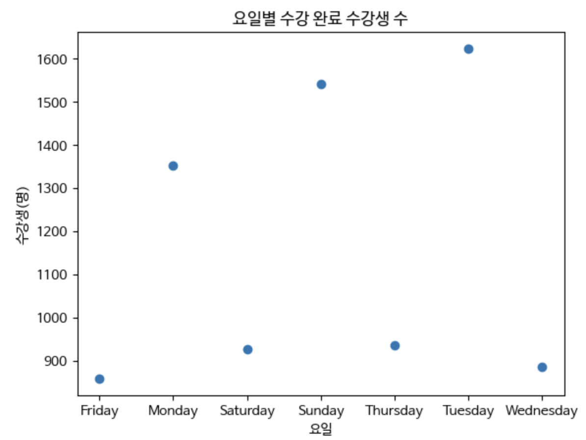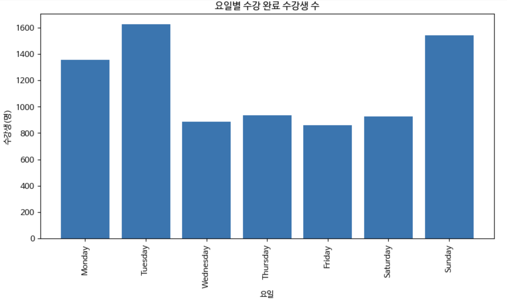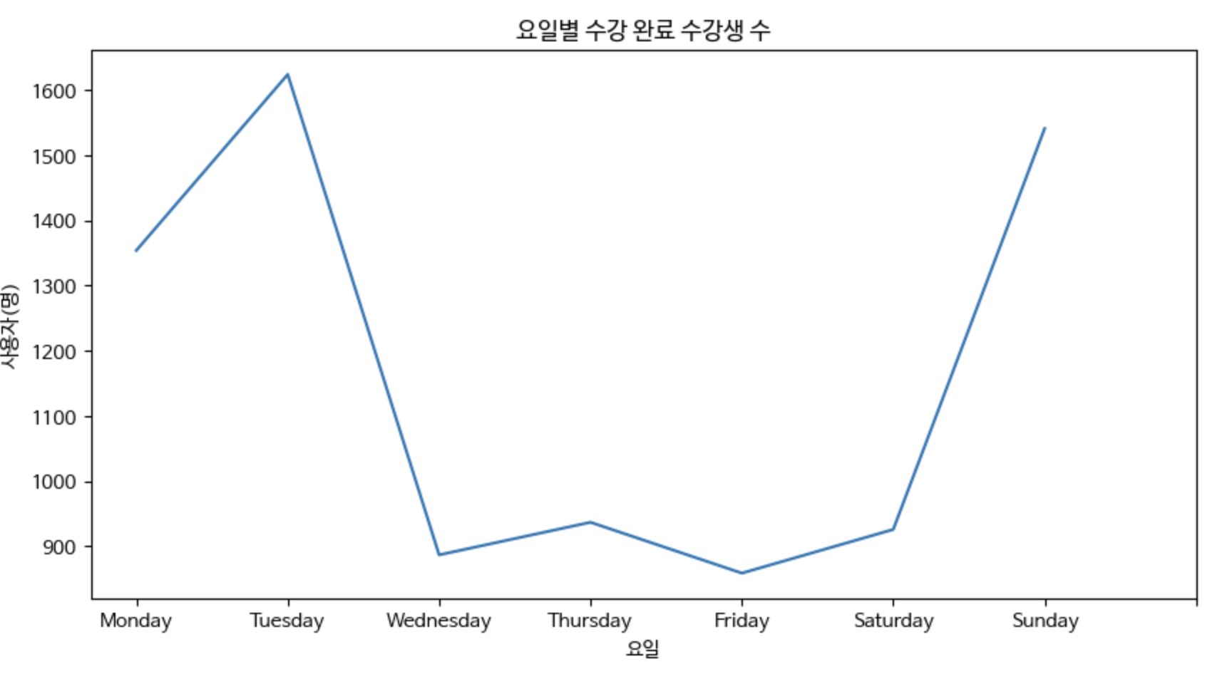 요일별로 보았을 때 일주일 중 화요일, 일요일에 가장 많은 수강생이 접속했고, 수요일, 금요일에 수강생이 제일 적었ㄷ다 |
