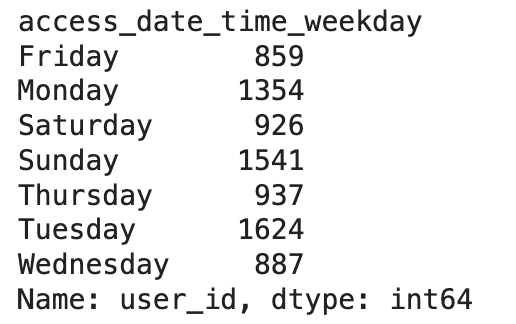 - 사용데이터: weekdata = sparta_data.groupby('access_date_time_weekday')['user_id'].count()