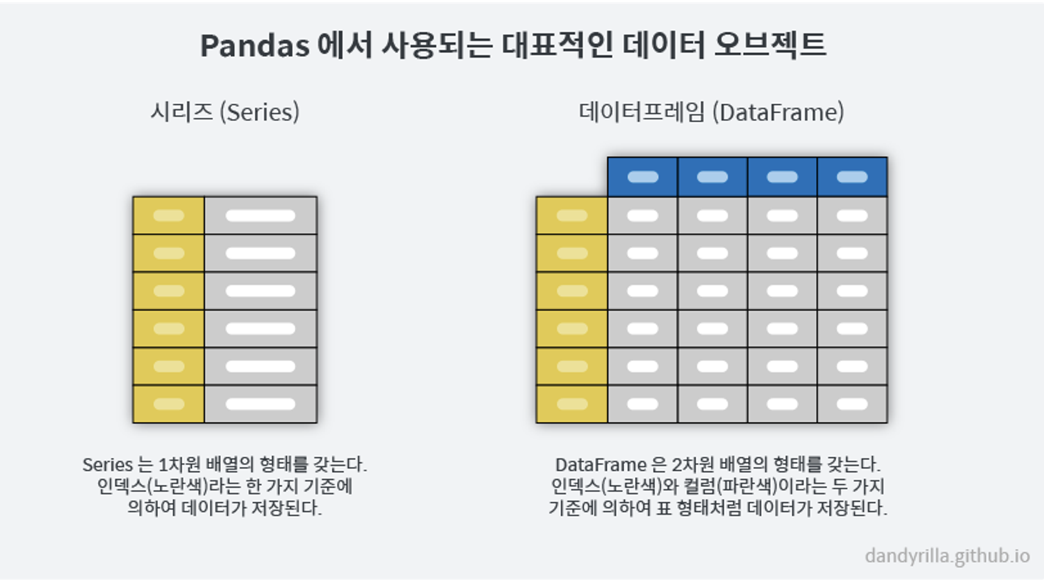 - 시즈르 객체로 구성되어있으며, 시리즈는 동일한 데이터 유형을 가진 1차원 배열