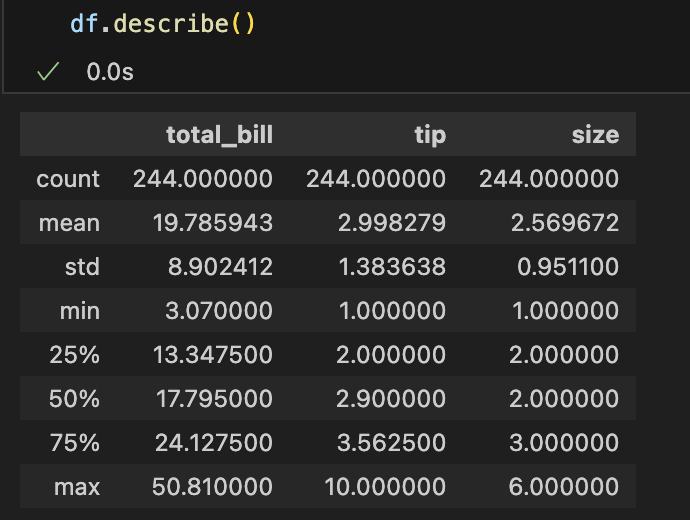 | .describe() : 데이터의 기초 통계량(개수, 평균, 중앙값 등) | ![]() |