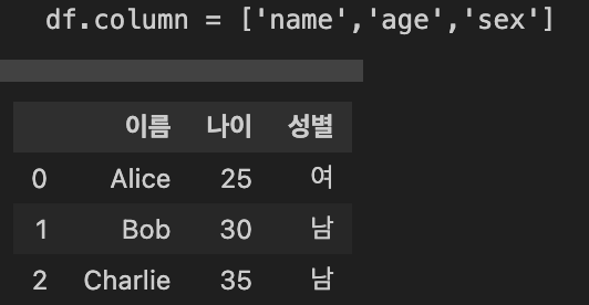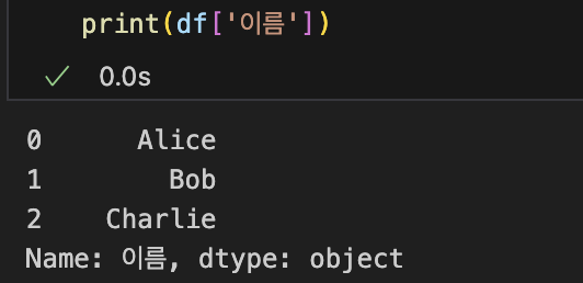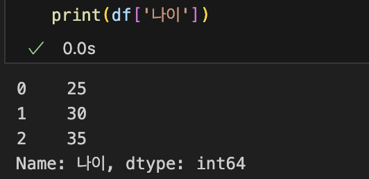 | print(df['이름']) | print(df['나이']) | print(df['성별']) |