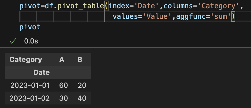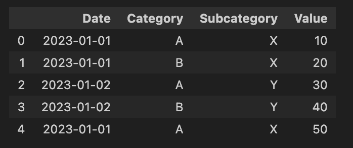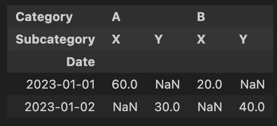 pivot = df.pivot_table(index='Date', columns=['Category','Subcategory'], values='Value',aggfunc='sum') |