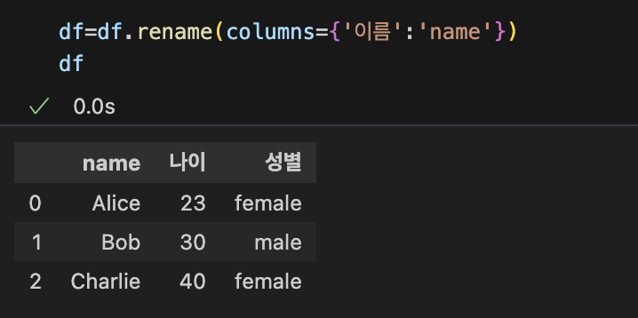 | 해당컬럼의 데이터 보기 | 데이터프레임의 컬럼보기 | 컬럼이름 바꾸기 |