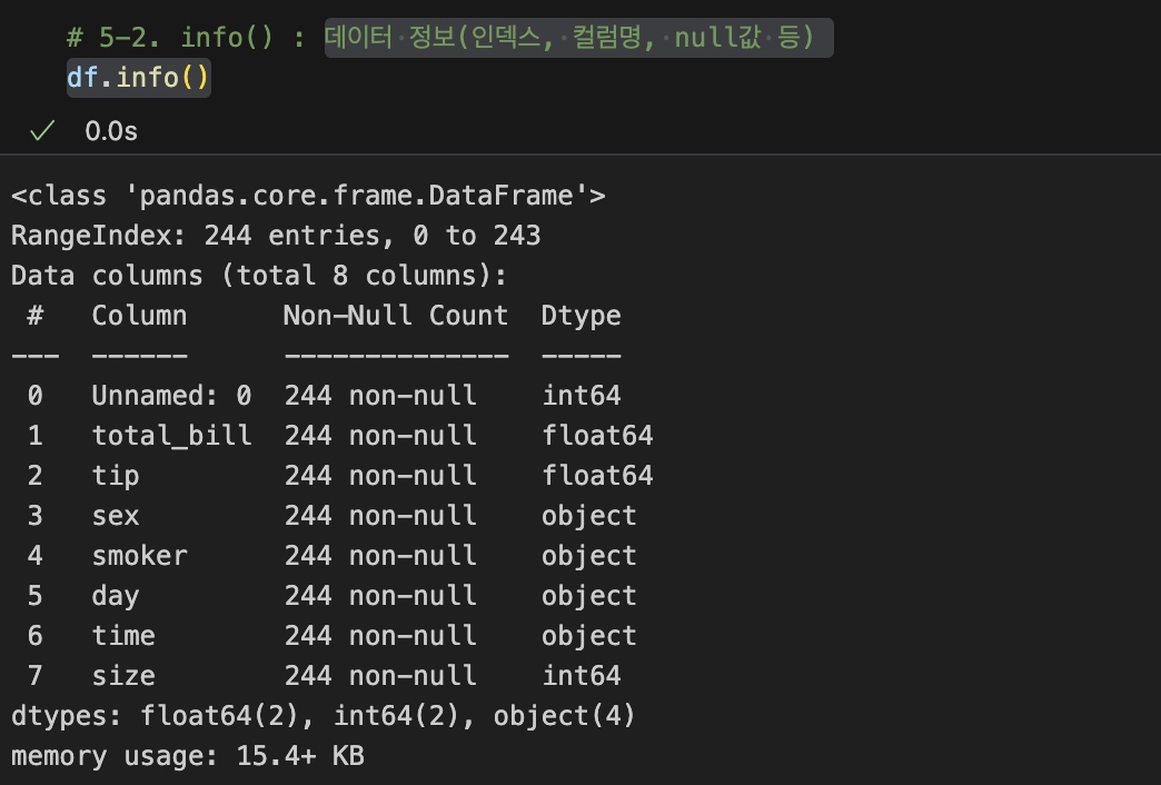 | 데이터프레임.info() : 데이터 정보(인덱스, 컬럼, null값 등) |