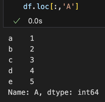 | df.loc[:, 'A'] #인덱스는 처음부터 끝까지, A컬럼만 |