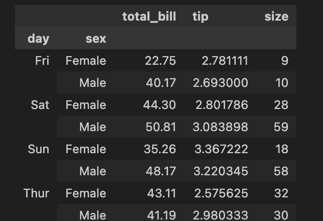 | #2개 이상의 컬럼을 그룹화지정 -> 리스트 #'day','sex'별 'total_bill','tip','size'의 평균 df[['day','sex','total_bill','tip','size']].groupby(['day','sex']).mean() |